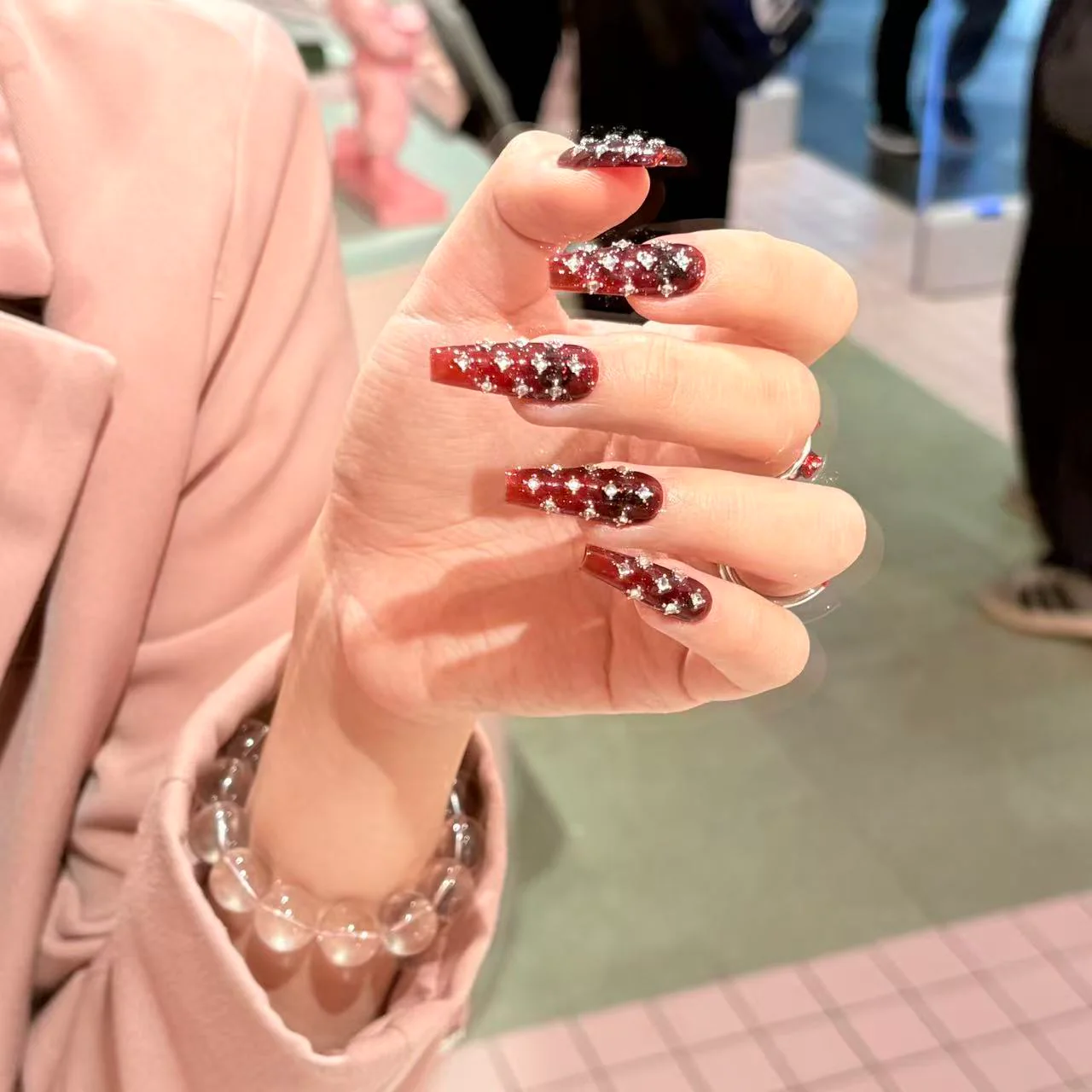 A deep crimson base fades like unfolding twilight, layered with dimensional crystal accents reminiscent of palace lanterns. This bold yet refined interpretation of Chinese red captures festive grandeur with modern sculptural shine.