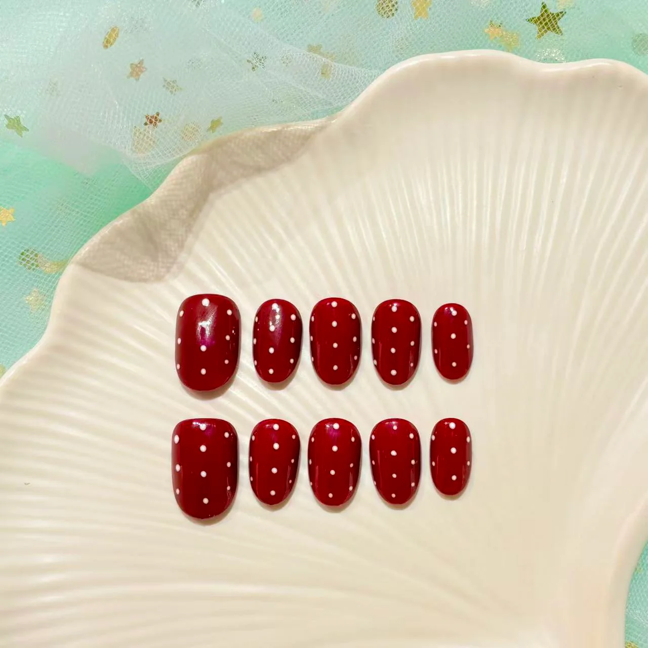 A vibrant Chinese red base adorned with playful white polka dots β like glowing lanterns under festive night skies. Traditional prosperity tones meet Western polka charm, creating a warm yet modern symbol of luck for the New Year.