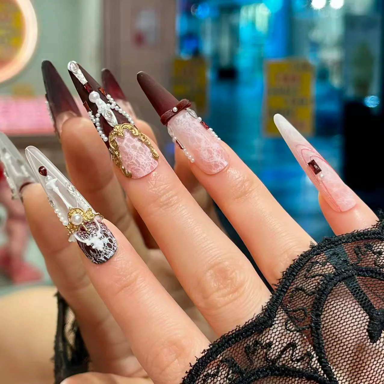 A lace-textured base layered with deep crimson and cascading pearl chains, evoking ceremonial garments in dim palace light. Ornate yet structured, this design intertwines Eastern embroidery aesthetics with gothic silhouettes — a dramatic, ritual-inspired festive statement.